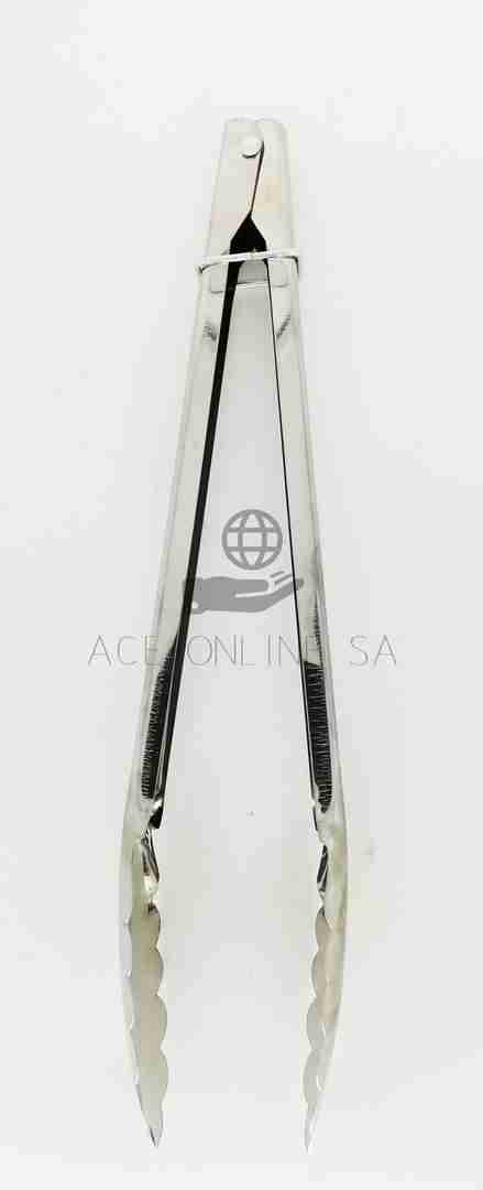 A food tong made of stainless steel for picking up light food like meat and salads.