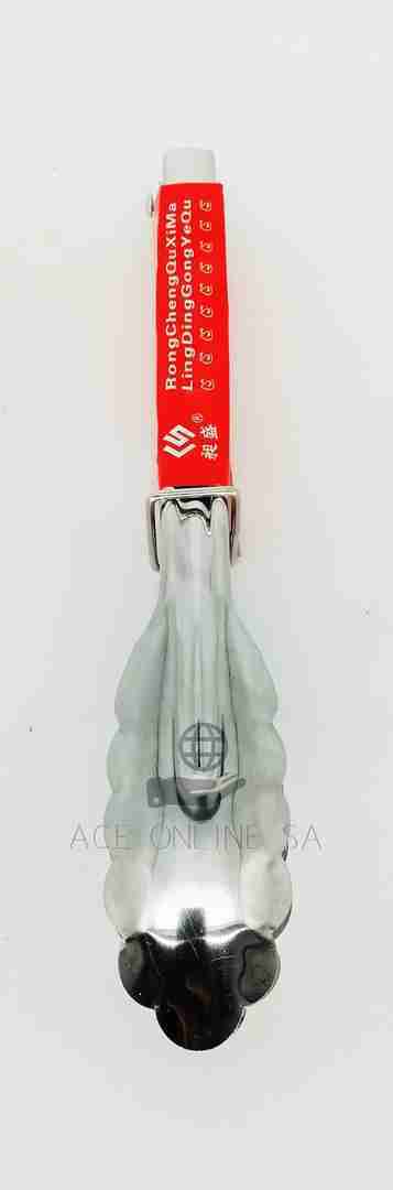 A food tong made of stainless steel for picking up light food like salads and meat.