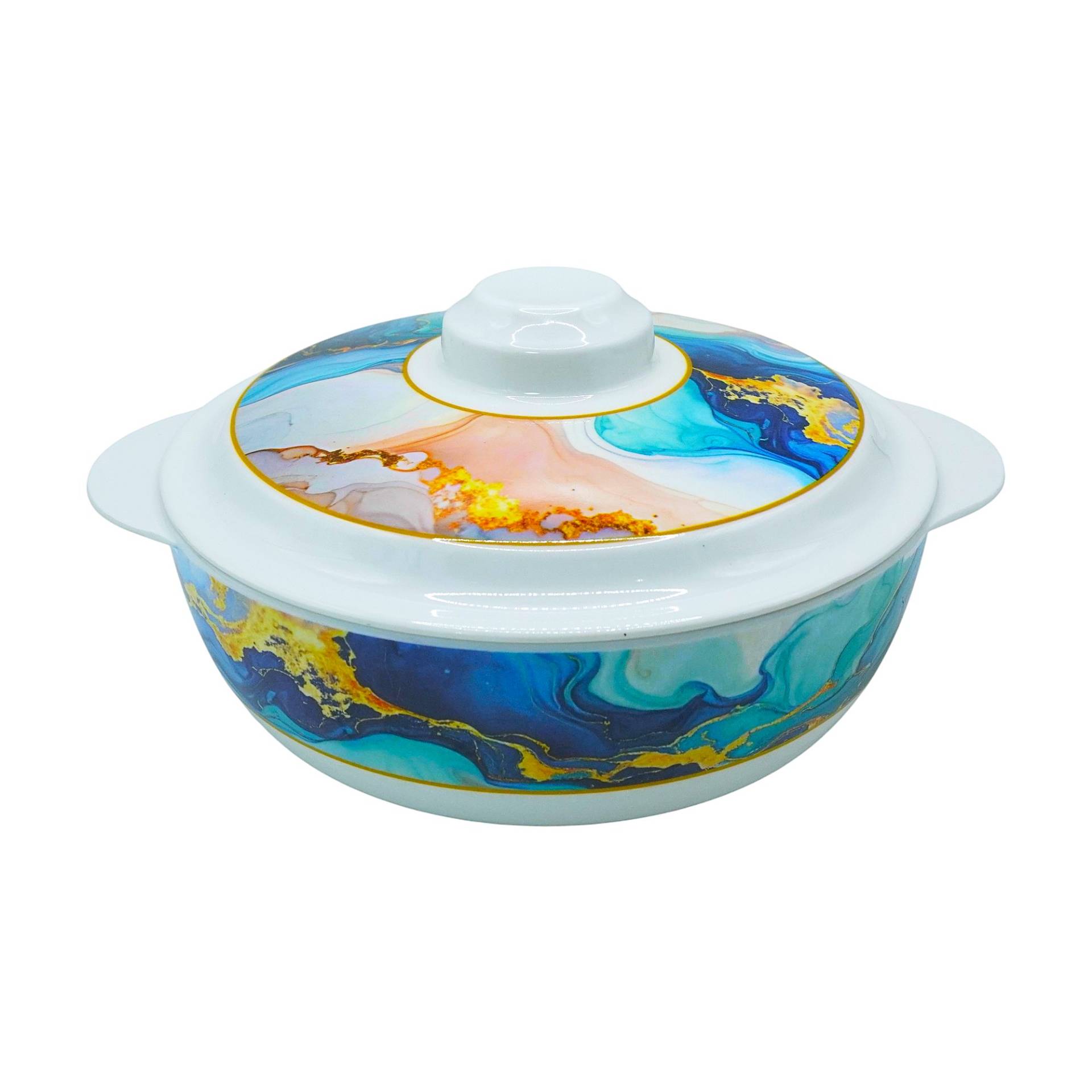 Design Details: Features a vibrant blue marble-patterned exterior with hand-painted gold-rimmed accents on both the bowl and the lid.